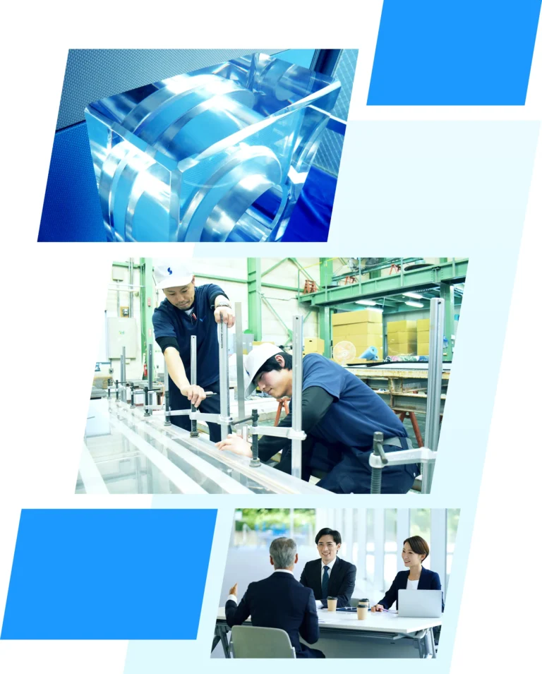 Among our production achievements, the large aquarium tanks installed in aquariums around the world are particularly notable. We began manufacturing large aquarium tanks in 1966, and over the years our artisan processing techniques have been passed down, allowing us to take pride in the beautiful finish we achieve with minimal distortion and high transparency.